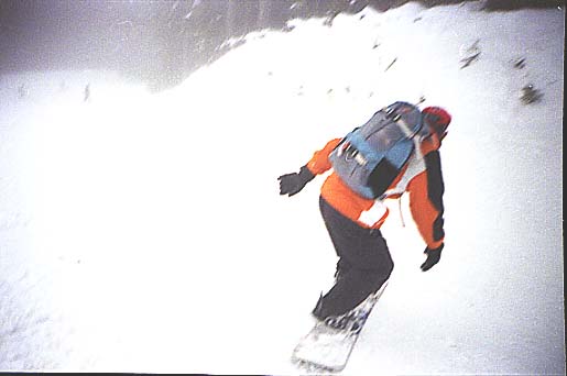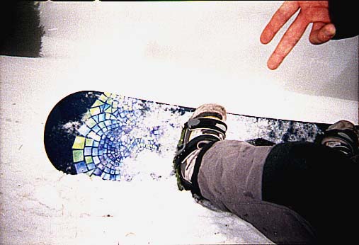 Hier sehen sie den als den "King of the hill" bekannten Freestyle-Boarder, der nach einem fast gestandenen 1080°-Stalefish-Backside-Air incl. Tailgrab in der Fakie-Variante sich dann doch für Ground attack entschloß und schon nach 30m zum Stehen kam- das Coping am Ende der Pipe mußte daran Schuld sein ... das nächste Mal mußte er den Kicker wieder persönlich schaufeln